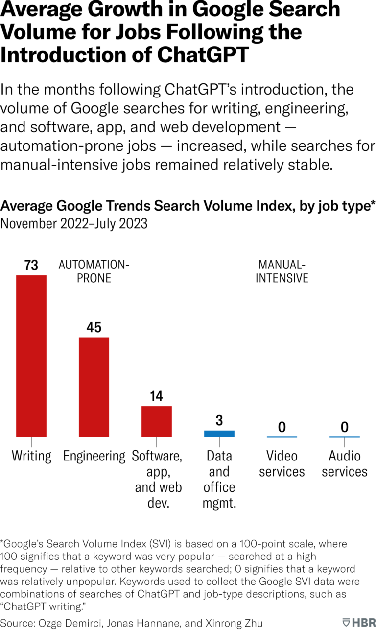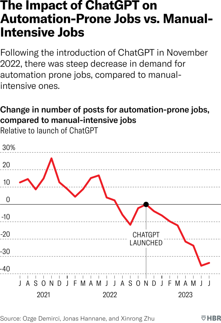 Laut einer neuen Studie von Harvard Business Review, die demnächst in der Fachzeitschrift Management Science erscheint, brach die Nachfrage in der Kategorie "leicht automatisierbare Tätigkeiten" um durchschnittlich 21 Prozent ein im Vergleich zu "manuell aufwendigen" Arbeiten.