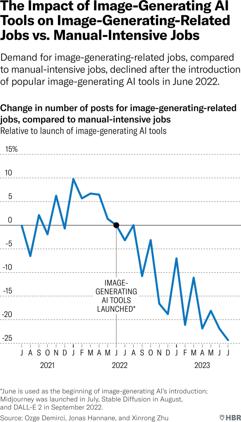 Die Auswirkungen beschränken sich nicht nur auf Textarbeit: Nach der Einführung von KI-Bildgeneratoren wie Midjourney, Stable Diffusion und DALL-E brach die Nachfrage nach Grafikdesignern und 3D-Modellierern, die Bilder, Designs und Grafiken erstellen, um 17,01 Prozent im Vergleich zu manuell aufwendigeren Tätigkeiten ein. Eine Erholung des Arbeitsmarktes zeichne sich nicht ab.