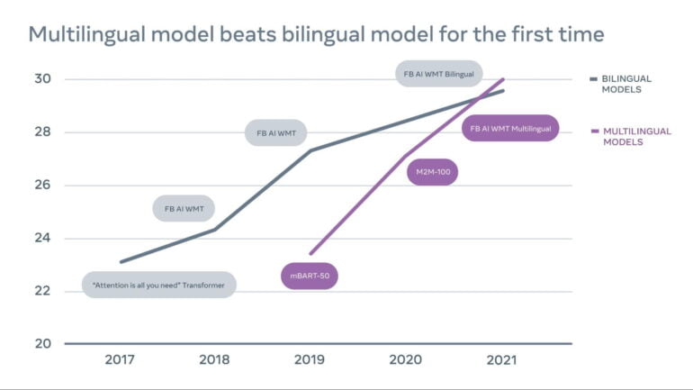 Im diesjährigen WMT2021-Benchmark, einem der wichtigsten KI-Übersetzungswettbewerbe, erreicht nun Metas multilinguales KI-Modell das erste Mal Bestwerte und übertrifft in mehreren Kategorien die besten bilingualen Modelle.