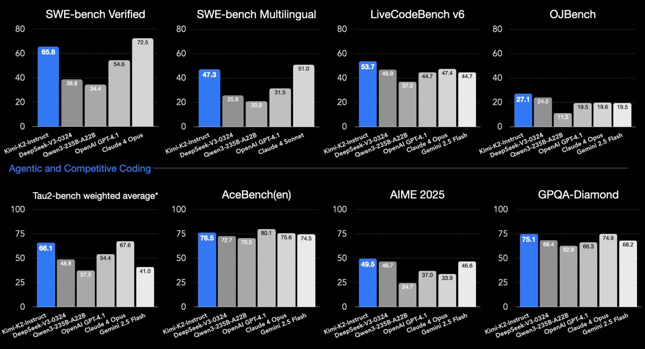 Bei LiveCodeBench (53,7 Prozent) und OJBench (27,1 Prozent) liegt Kimi-K2 sogar vor allen Konkurrenten ohne Reasoning. Diese Benchmarks messen die Fähigkeit von Sprachmodellen, Programmieraufgaben direkt zu lösen – entweder interaktiv (LiveCodeBench) oder als klassische Wettbewerbsprobleme (OJBench).
