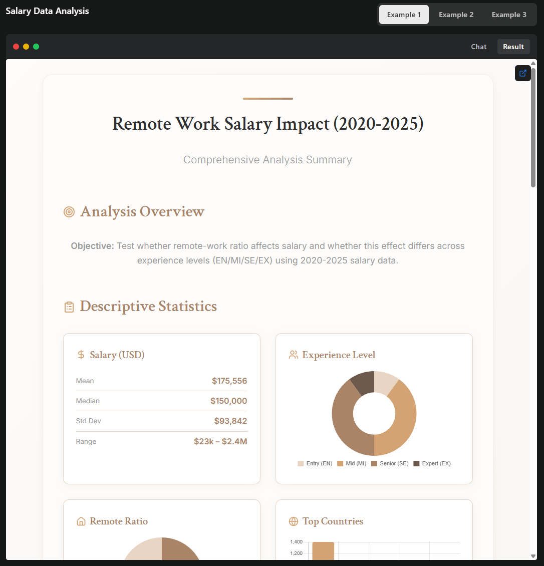 In einem Beispiel analysierte das Modell Gehaltsdaten im Zusammenhang mit Remote-Arbeit, führte eine statistische Auswertung durch und generierte eine interaktive HTML-Seite mit personalisierbarem Empfehlungstool – alles im Rahmen eines einzigen agentischen Ablaufs.