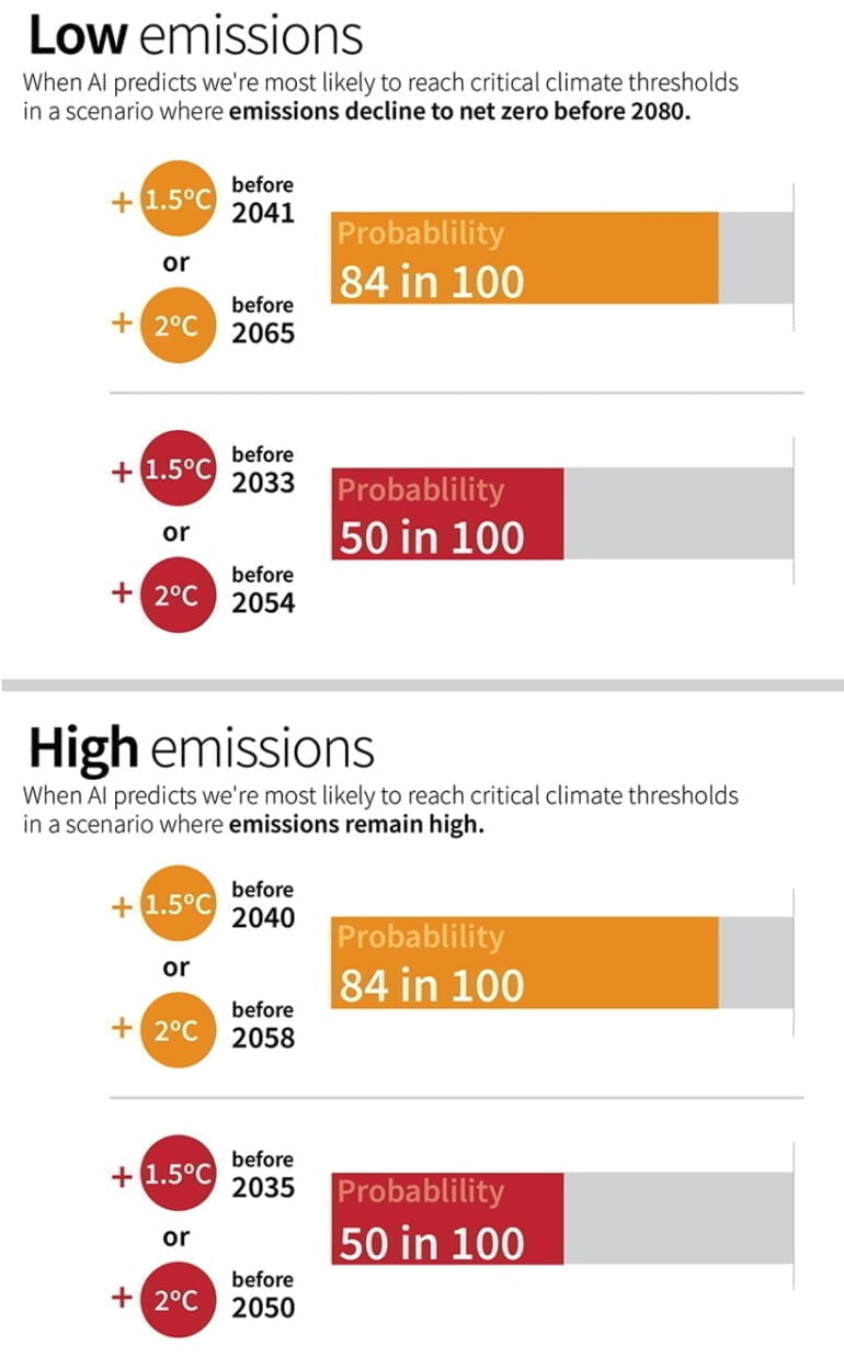 "Wenn die Emissionen in den nächsten Jahrzehnten hoch bleiben, prognostiziert die KI eine Chance von eins zu zwei, dass sich die Erde im Vergleich zur vorindustriellen Zeit bis Mitte dieses Jahrhunderts um durchschnittlich 2 Grad Celsius erwärmt, und eine Chance von mehr als vier zu fünf, dass diese Schwelle bis 2060 erreicht wird."