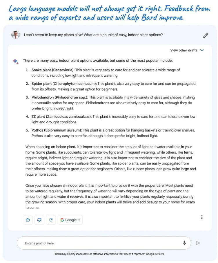 Dennoch teilt Bard die üblichen Schwächen großer Sprachmodelle. Google verweist auf mögliche Vorurteile und soziale Verzerrungen in den Antworten und falsche Informationen, die mit großer Selbstsicherheit präsentiert werden. Trotz dieser Probleme habe Bard ein großes Potenzial zur Förderung von Produktivität und Kreativität oder für die Recherche.