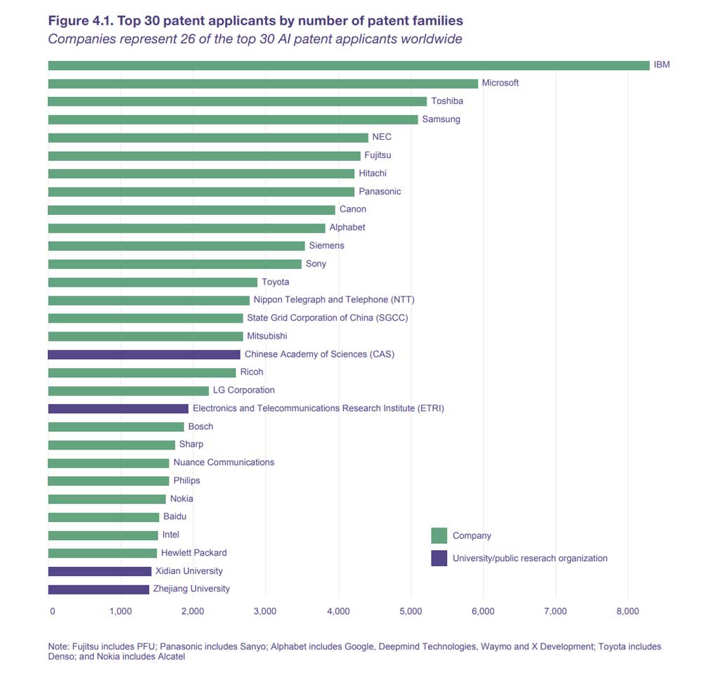 26 der 30 wichtigsten Patentanmelder sind Unternehmen, vier sind öffentliche Forschungseinrichtungen, drei davon in China. In der Spitzengruppe sind IBM mit 8.290 Patenten, Microsoft mit 5.930 Patenten gefolgt von Toshiba (5.223), Samsung (5.102) und der NEC-Gruppe (4.406).