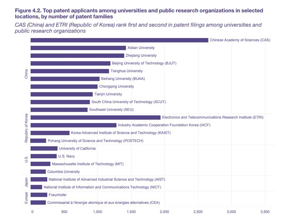 17 der 20 größten akademischen Patentanmelder sind chinesische Forschungsinstitute, drei weitere sitzen in Südkorea.