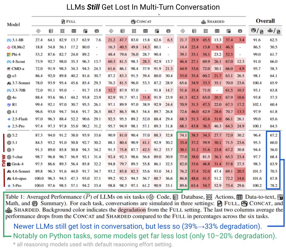 Auch die neue Generation großer Sprachmodelle (LLMs) ab GPT-5 hat nach wie vor Probleme, wenn Aufgaben über mehrere Gesprächsrunden verteilt werden. Forscher Philippe Laban und sein Team testeten aktuelle Modelle in sechs Aufgaben: Code, Datenbanken, Aktionen, Daten-zu-Text, Mathematik und Zusammenfassungen. Ergebnis: Die Leistung sinkt deutlich, wenn Informationen über mehrere Nachrichten verteilt (sharded) statt in einer einzigen Anfrage (concat) gegeben werden.