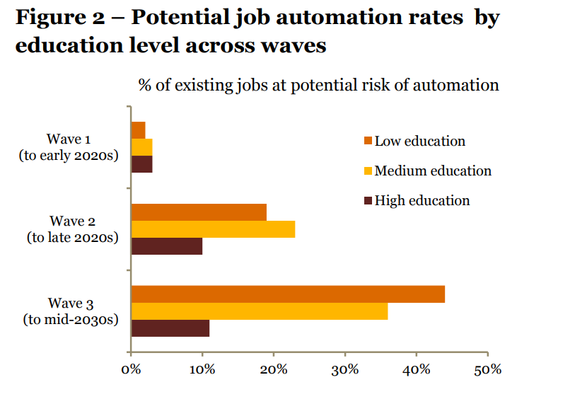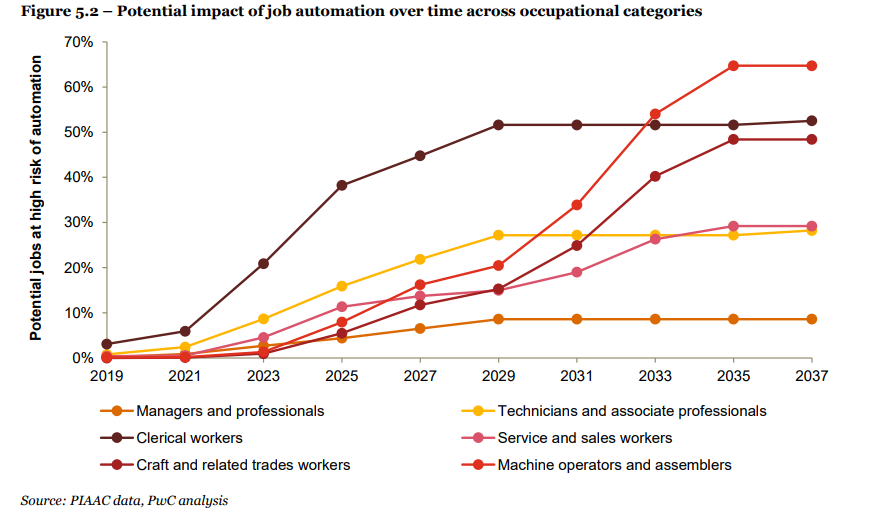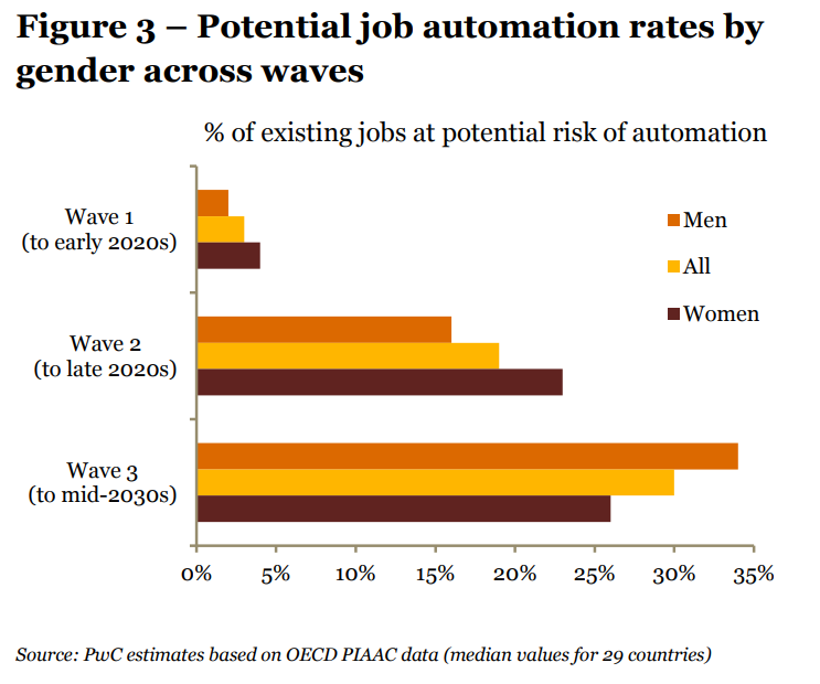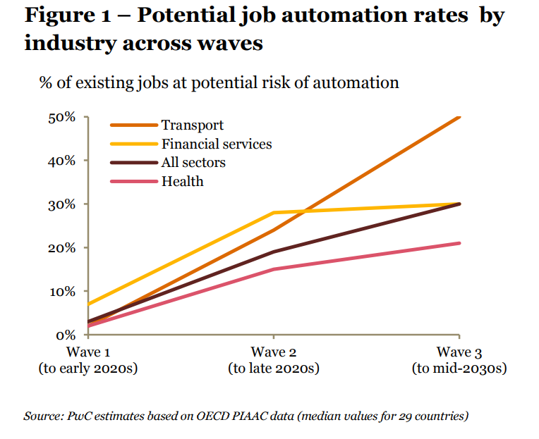 Laut einer Untersuchung der Unternehmensberater von Pricewaterhousecoopers (PWC) kommt ein durch Künstliche Intelligenz bedingter Stellenabbau in drei Wellen. Die dritte Welle soll die größten Auswirkungen haben und Mitte der 2030er ihren Höhepunkt erreichen.