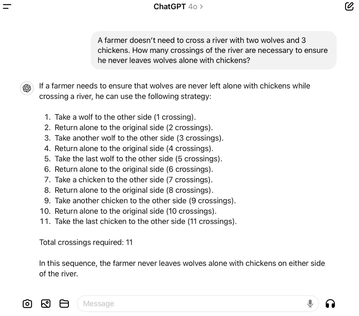 So heißt es im folgenden Aufgabenbeispiel, der Bauer müsse den Fluss gar nicht überqueren. Dennoch schlägt das LLM insgesamt neun Überquerungen vor, bei denen die im Rätsel erwähnten Wölfe garantiert alle Hühner gefressen hätten, da der Bauer seine Hühner ständig mit den Wölfen allein gelassen hätte. Eine Bedingung war jedoch, dass der Bauer die Hühner nie allein ließ, was möglich gewesen wäre, da er laut Rätsel den Fluss gar nicht überqueren wollte.