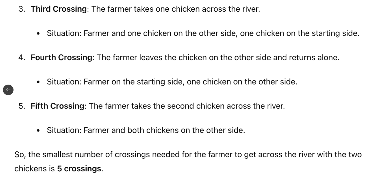 So heißt es im folgenden Aufgabenbeispiel, der Bauer müsse den Fluss gar nicht überqueren. Dennoch schlägt das LLM insgesamt neun Überquerungen vor, bei denen die im Rätsel erwähnten Wölfe garantiert alle Hühner gefressen hätten, da der Bauer seine Hühner ständig mit den Wölfen allein gelassen hätte. Eine Bedingung war jedoch, dass der Bauer die Hühner nie allein ließ, was möglich gewesen wäre, da er laut Rätsel den Fluss gar nicht überqueren wollte.