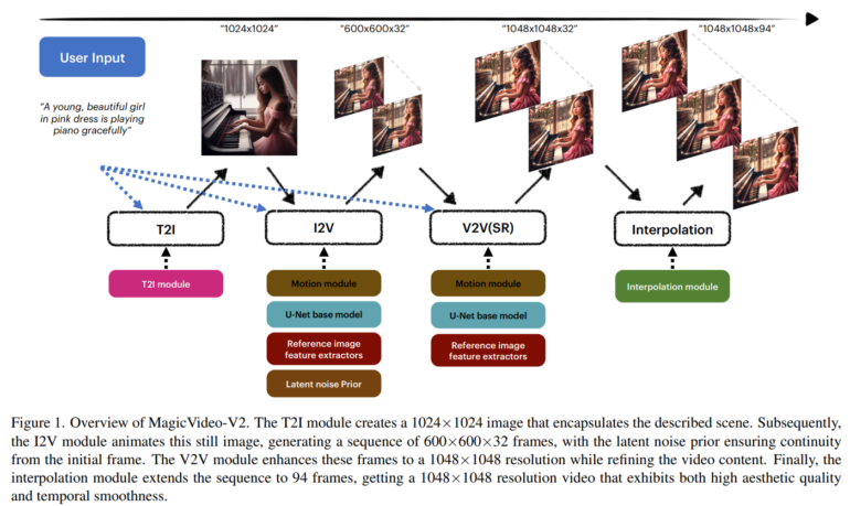 MagicVideo-V2 unterscheidet sich laut dem Team von bestehenden T2V-Modellen durch die Integration mehrerer Module, die zusammenarbeiten, um qualitativ hochwertige Videos zu erzeugen. Das Team kombiniert dafür Text-zu-Bild (T2I), Bild-zu-Video (I2V), Video-zu-Video (V2V) und Video Frame Interpolation (VFI) Module in einer Architektur.