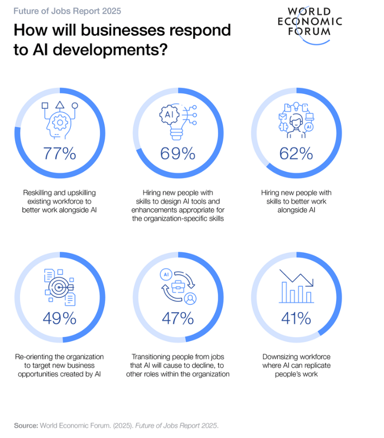 Eine neue Studie des Weltwirtschaftsforums zeigt: Während die meisten Unternehmen auf Weiterbildung setzen, plant fast die Hälfte auch Stellenkürzungen durch KI-Automatisierung.