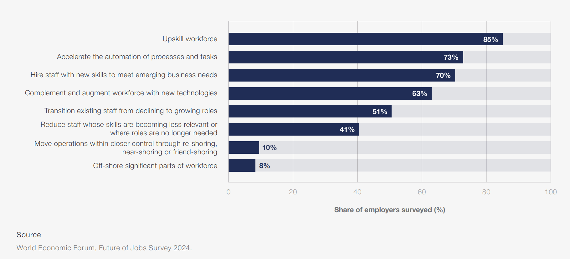 70 Prozent der befragten Organisationen planen, neue Mitarbeiter mit zukunftsrelevanten Fähigkeiten einzustellen. 51 Prozent wollen Beschäftigte intern von schrumpfenden in wachsende Bereiche versetzen.