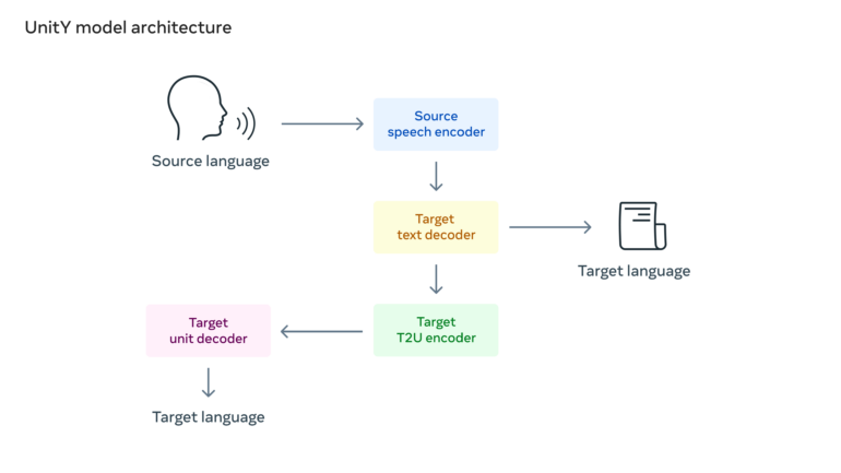 Für die Sprache-zu-Sprache-Übersetzung verwendete Meta eine Speech-to-Unit Translation (S2UT), die einen Sprachinput in akustische Einheiten in einem von Meta entwickelten Pfad übersetzt. Mit UnitY als Zwei-Pass-Decodiermechanismus generierte der Decoder im ersten Durchlauf Text in einer verwandten Sprache (Mandarin) und erstellt im zweiten Durchlauf akustische Einheiten.