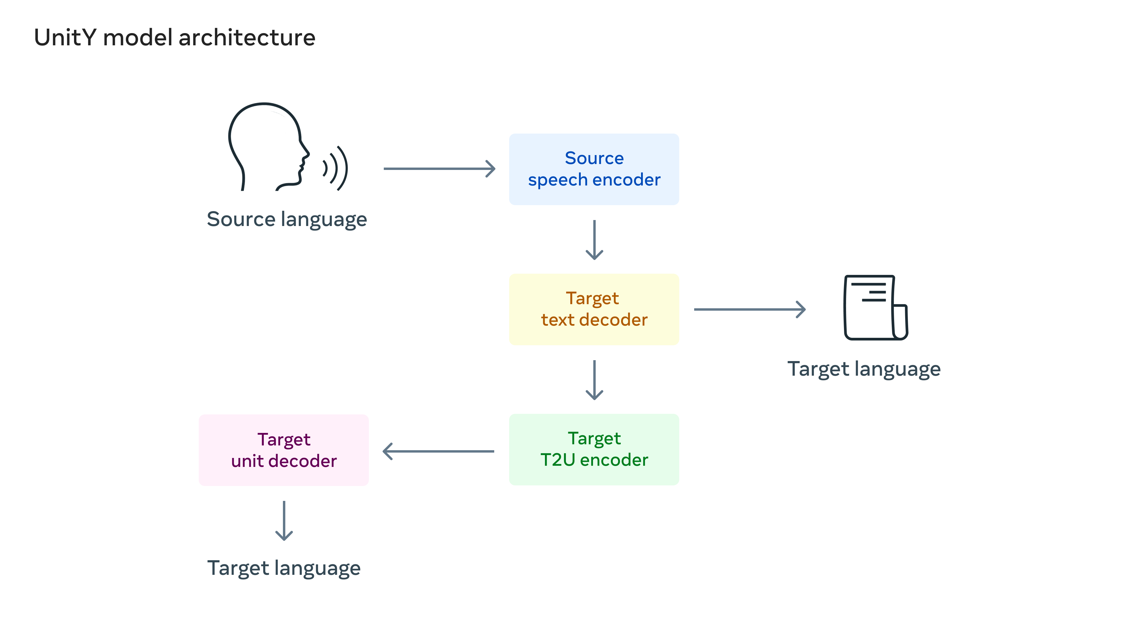 Für die Sprache-zu-Sprache-Übersetzung verwendete Meta eine Speech-to-Unit Translation (S2UT), die einen Sprachinput in akustische Einheiten in einem von Meta entwickelten Pfad übersetzt. Mit UnitY als Zwei-Pass-Decodiermechanismus generierte der Decoder im ersten Durchlauf Text in einer verwandten Sprache (Mandarin) und erstellt im zweiten Durchlauf akustische Einheiten.