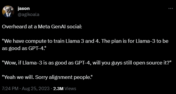 Dies berichtet zumindest der OpenAI-Ingenieur Jason Wei, der früher bei Google Brain gearbeitet hat. Auf einem von Meta organisierten Social Event der Generative AI Group habe er ein Gespräch belauscht, in dem es hieß, Meta verfüge nun über genügend Rechenleistung, um Llama 3 und 4 zu trainieren. Llama 3 soll das Niveau von GPT-4 erreichen, aber frei verfügbar bleiben.