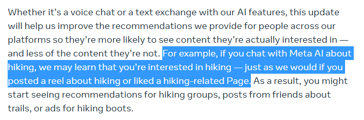 Meta will zukünftig Chatbot-Konversationen für die Werbeindividualisierung nutzen. In einem Blogpost kündigt das Unternehmen an, ab dem 16. Dezember 2025 auch Interaktionen mit Meta AI – etwa per Text oder Sprache – zur Personalisierung von Inhalten und Anzeigen auf Facebook und Instagram zu verwenden. Wer zum Beispiel mit der KI über Wandern spricht, soll künftig passende Gruppen, Beiträge oder Werbung sehen. Ausgenommen bleiben sensible Themen wie Religion, Gesundheit oder politische Ansichten.