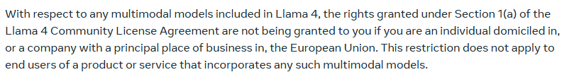 Die Llama-4-Modelle werden unter der bekannten Llama-Lizenz veröffentlicht - mit einer Neuerung für die EU: Die Nutzung der multimodalen Modelle ist für Unternehmen mit Sitz in der EU oder für Einzelpersonen mit Wohnsitz in der EU ausgeschlossen. Die Restriktion bezieht sich nicht auf Endverbraucher.