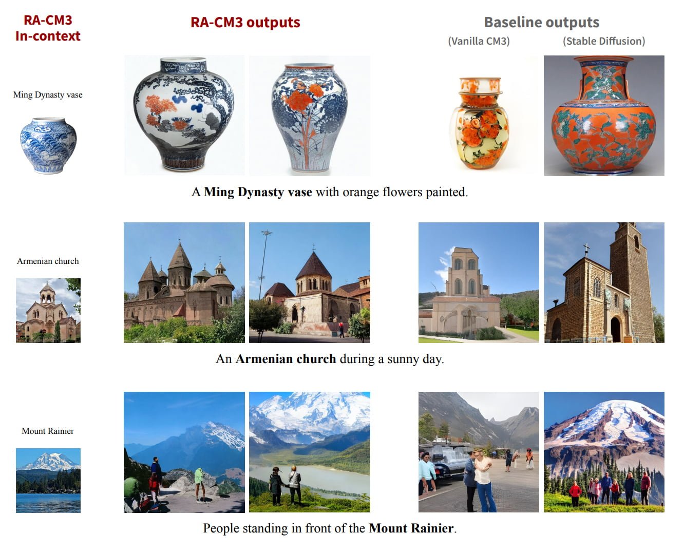 In einer neuen Arbeit zeigen nun Forschende von Meta, der Stanford University und der University of Washington das generative Modell RA-CM3 (Retrieval Augmented CM3), das ebenfalls auf eine externe Datenbank zugreifen kann. CM3 steht für "Causal Masked Multimodal Model" und ist ein von Meta Anfang 2022 vorgestelltes Transformer-Modell, das Bilder und Texte generieren kann.