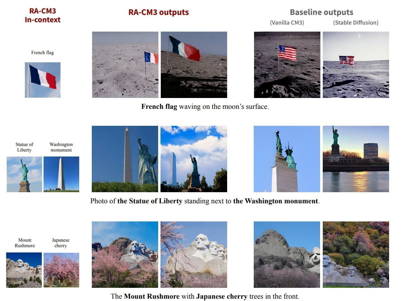 Beide Datenströme werden dann an den multimodalen Generator geleitet, der anschließend Text, Bild oder beides generiert. RA-CM3 kann die externen Bild- und Text-Daten nutzen, um etwa Bilder näher an den Anforderungen des Prompts zu generieren oder korrekte Bild-Unterschriften zu generieren. Durch die Datenbank kann das Modell etwa einen bestimmten Berg, ein bestimmtes Gebäude oder ein Monument deutlich besser in ein neues Bild verarbeiten.
