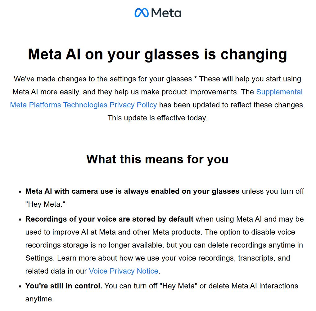 Meta selbst beschreibt die Änderungen in einer aktuellen Mitteilung als notwendig, um Meta AI "einfacher nutzbar" zu machen und die Produkte weiter zu verbessern, und dass Nutzer "weiterhin die Kontrolle" behalten – in der Praxis beschränkt sich diese Kontrolle jedoch auf manuelle Löschfunktionen und das komplette Abschalten der Sprachsteuerung.
