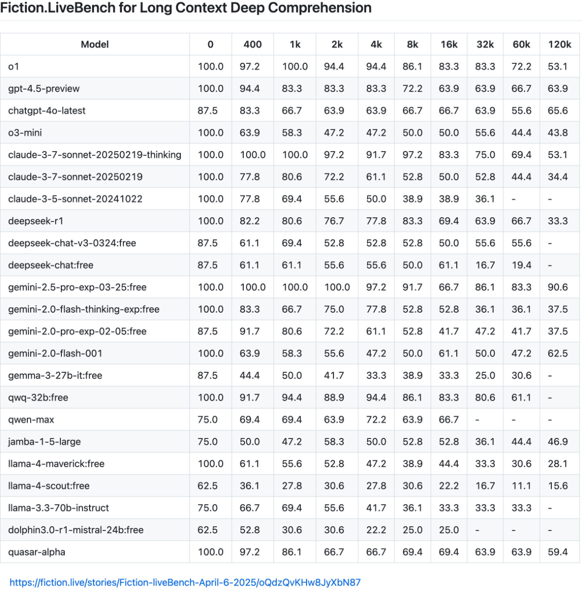 Besonders enttäuschend schneiden die Llama-4-Modelle bei Tests der Plattform Fiction.live ab, die speziell das Verstehen von komplexen Langtextinhalten anhand vielschichtiger Geschichten testet.