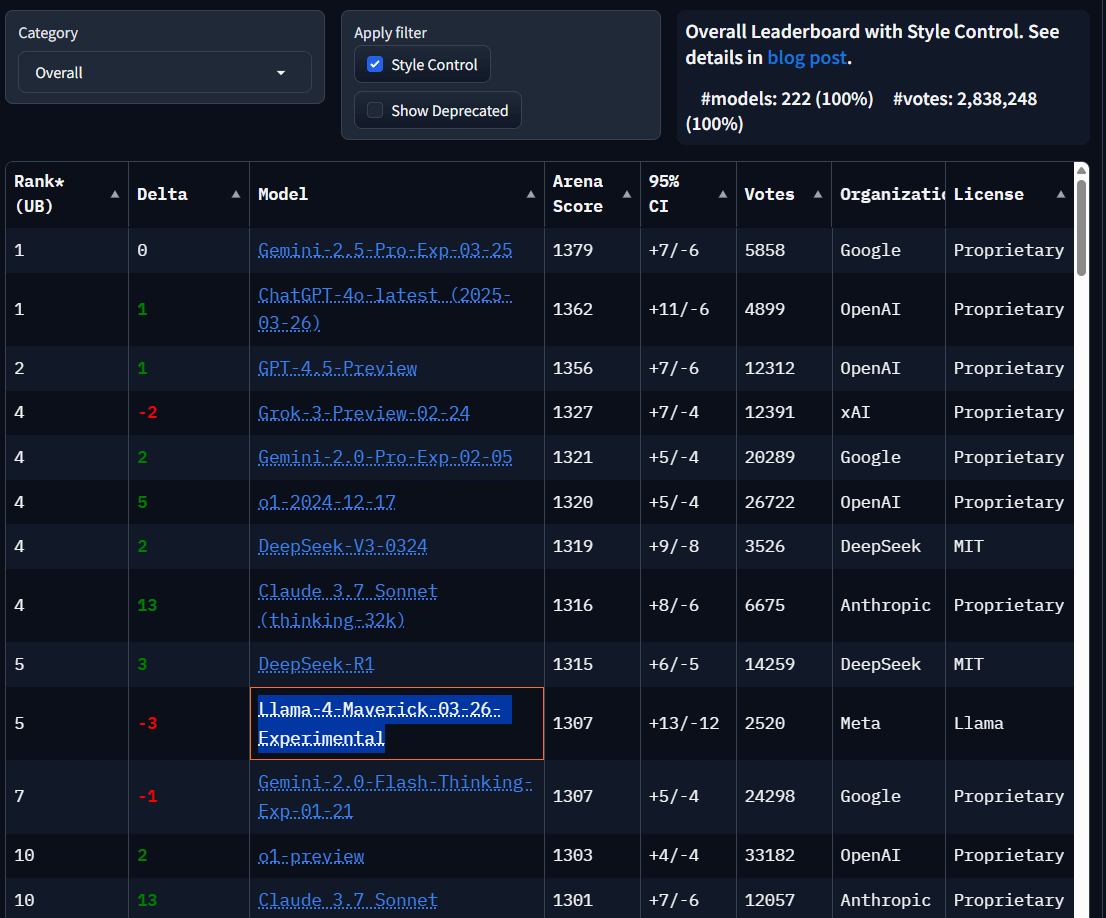 In der Tat: Mit aktivierter "Style Control" von LMArena - einer Methode, die zwischen inhaltlicher Substanz und stilistischer Präsentation unterscheidet - fällt Llama 4 in den Rankings von Platz 2 auf Platz 5 zurück. Die Style-Control-Methode versucht, den Einfluss von Faktoren wie Antwortlänge und Formatierung auf die Bewertung zu berücksichtigen, um die inhaltliche Qualität besser isolieren zu können.