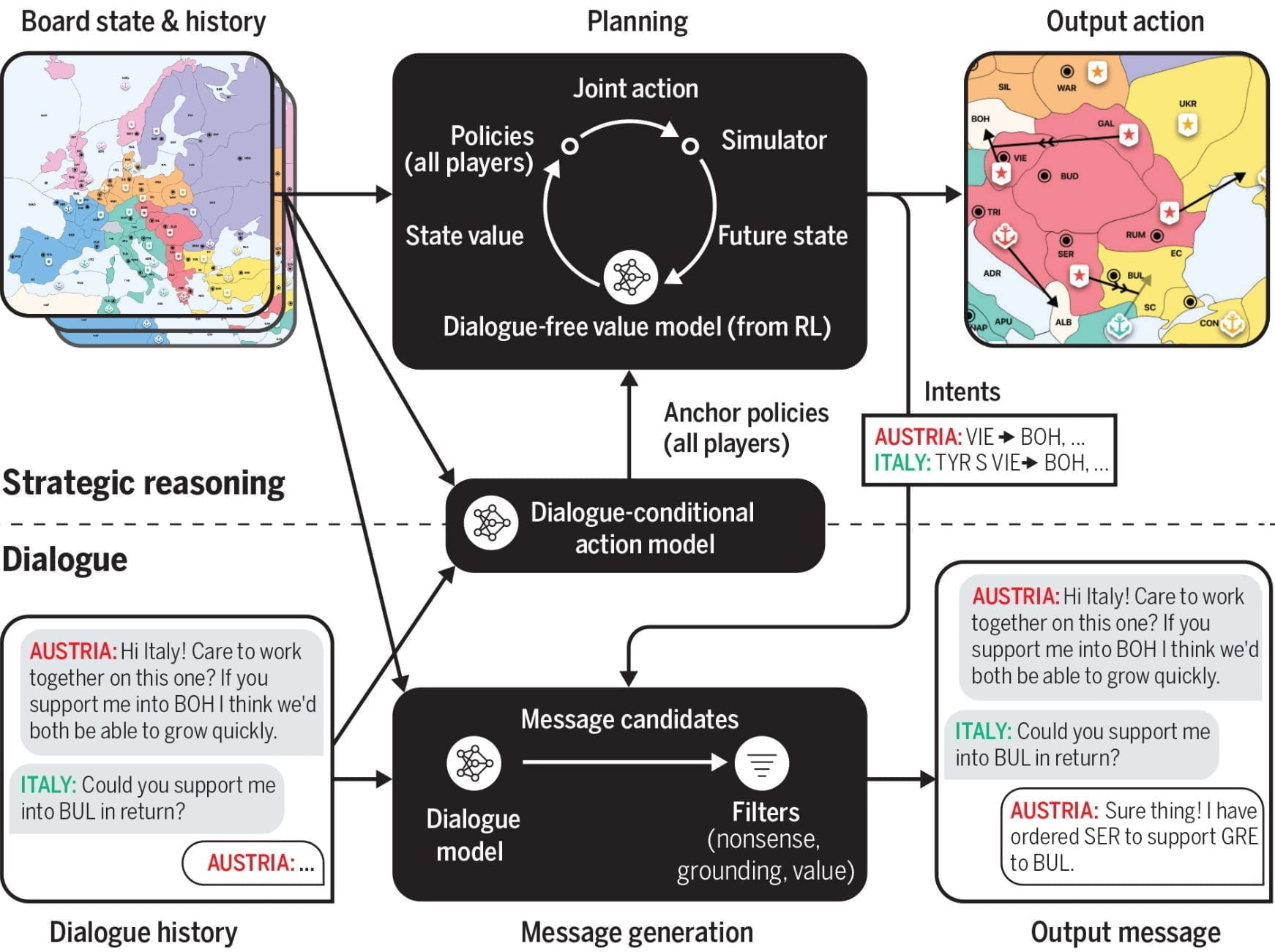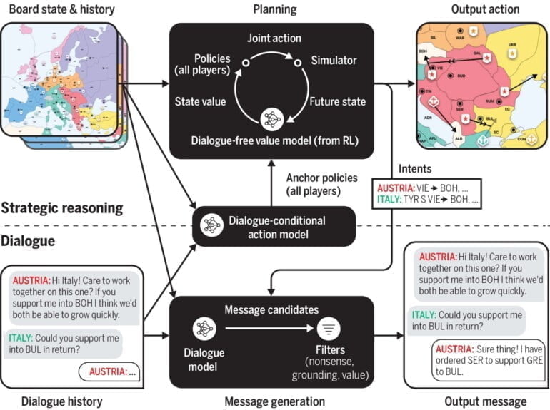 Im Kern arbeitet CICERO mit zwei Systemen: Eines plant die Spielzüge für sich und Partner, das zweite setzt diese Spielzüge dann in natürliche Sprache um und erklärt sie den Spielenden, versucht sie, von der eigenen Strategie zu überzeugen.