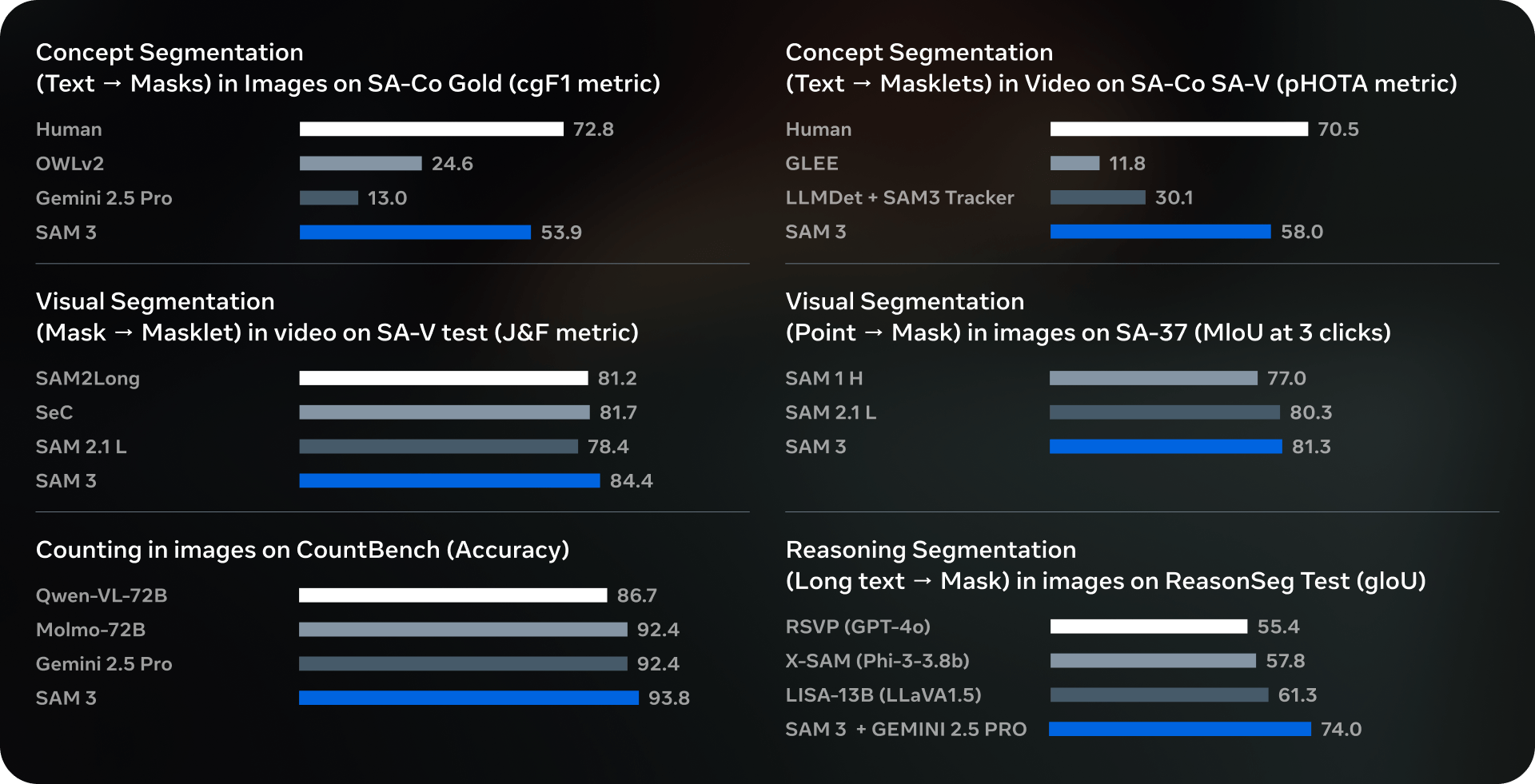 In internen Benchmarks, speziell dem neu eingeführten "Segment Anything with Concepts" (SA-Co), soll SAM 3 eine doppelt so hohe Leistung wie existierende Systeme erreichen. In Vergleichstests übertrifft SAM 3 laut Meta sowohl spezialisierte Modelle wie GLEE und OWLv2 als auch große multimodale Modelle wie Gemini 2.5 Pro.