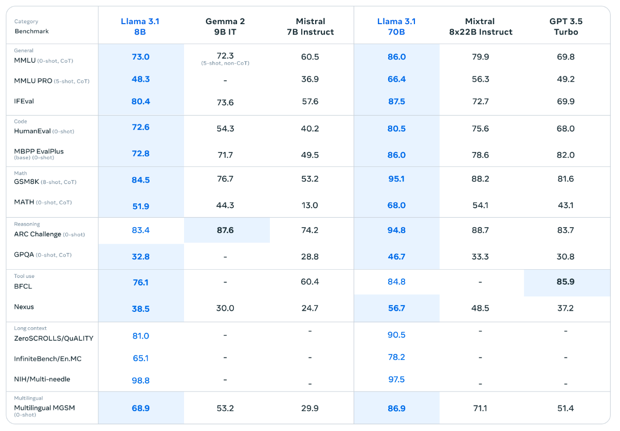 Die kleineren 3.1 Llama-Modelle mit 70 und 8 Milliarden Parametern wurden laut Meta mit generierten Daten des 405B Modells optimiert. Sie sind ebenfalls mindestens auf Augenhöhe mit vergleichbaren Modellen, die jedoch mit Ausnahme von GPT-3.5 Turbo ebenfalls Open Source sind.