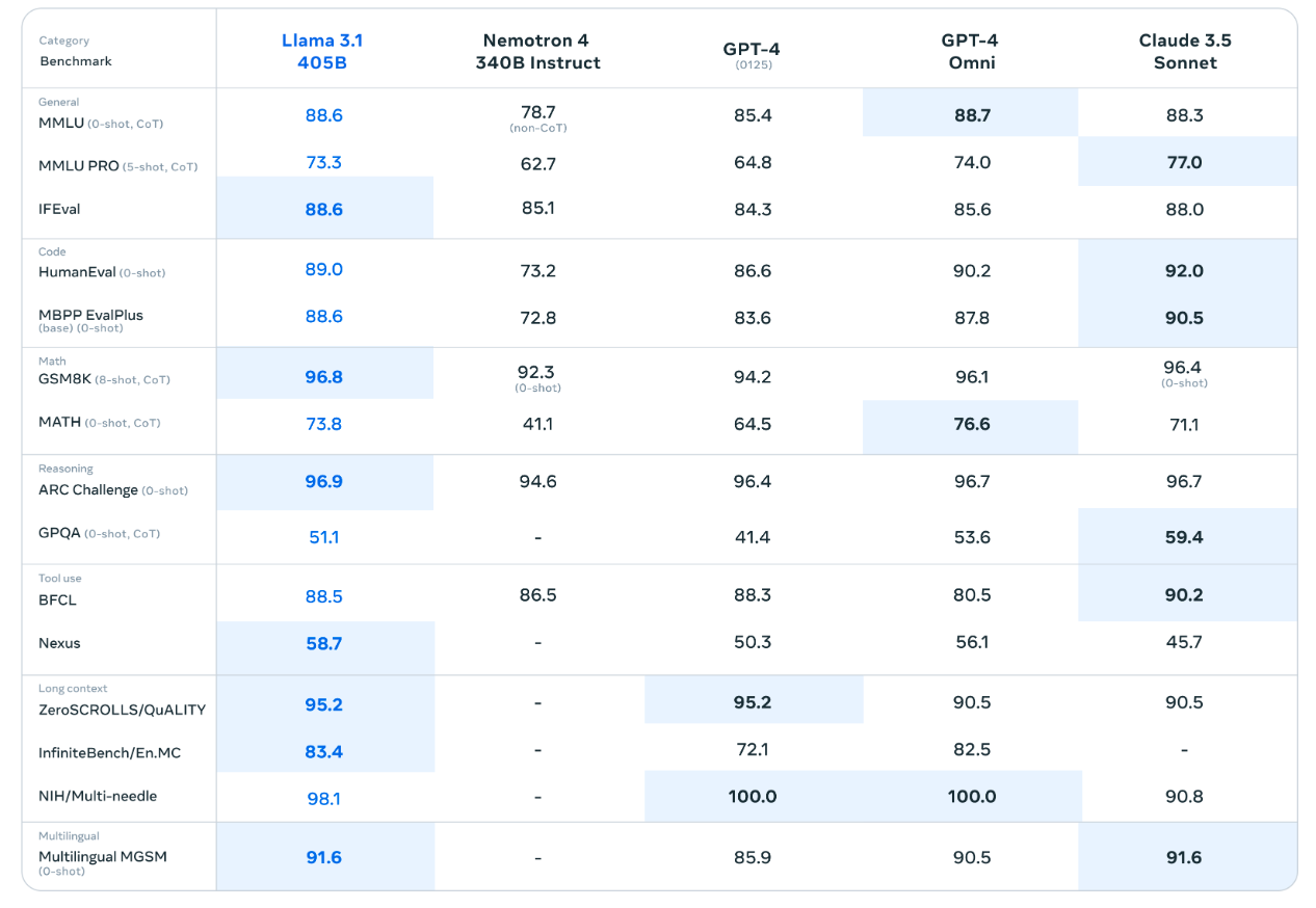 Das größte Modell ist Llama 3.1 405B - laut Meta das erste "Frontier-Level Open Source AI Model". In internen Benchmarks übertrifft es GPT-4o, eine frühere Version von GPT-4, sowohl bei Aufgaben in englischer Sprache als auch bei Aufgaben, die Fähigkeiten in mehreren Sprachen erfordern.