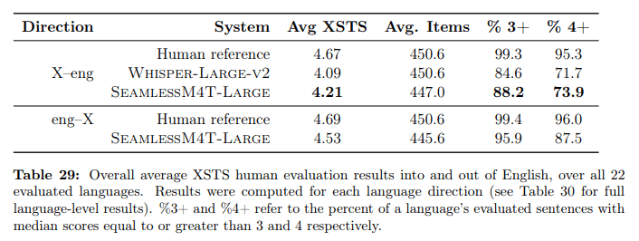 Auch bei der menschlichen Bewertung liegt das größte SeamlessM4T-Modell vor Whisper, allerdings ist der Abstand geringer. Beide Modelle liegen qualitativ noch hinter den menschlichen Übersetzungen, aber der Abstand verringert sich mit jedem neuen Modell.