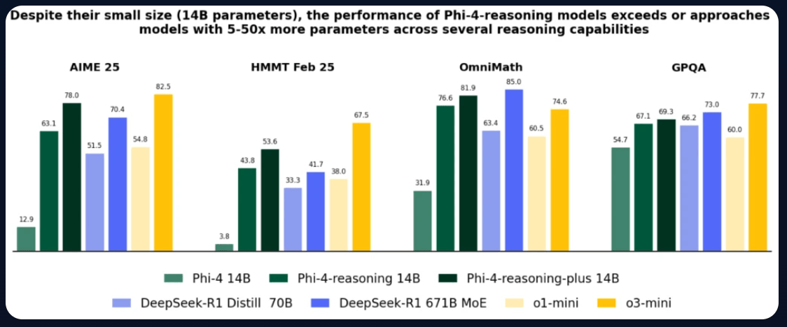 Beide Modelle übertreffen laut Microsoft deutlich größere Sprachmodelle wie OpenAI o1-mini und DeepSeek-R1-Distill-Llama-70B – letzteres ist fünfmal größer. Selbst im Vergleich zum 671-Milliarden-Parameter-Modell DeepSeek-R1 schneiden die Phi-Modelle auf dem AIME-2025-Test, einer Qualifikation zur US-Mathematik-Olympiade, besser ab.