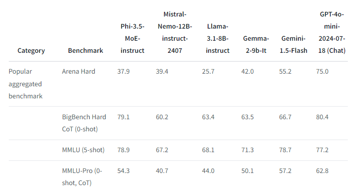 In Benchmarks erreicht es mit dieser geringen Zahl aktiver Parameter ein ähnliches Niveau beim Sprachverständnis und in Mathematik wie viel größere Modelle. In Reasoning-Aufgaben übertrifft es sogar einige größere Modelle und liegt nur hinter GPT-4o-mini. Auch bei multilingualen Aufgaben ist es trotz der geringen aktiven Parameterzahl wettbewerbsfähig.