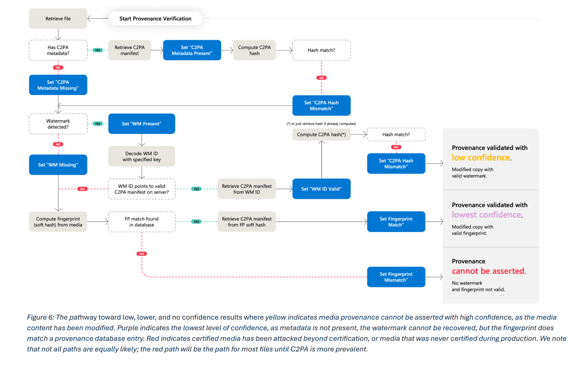 Microsoft warnt ausdrücklich davor, dass einige dieser Anforderungen technisch nicht erfüllbar sind. Sichtbare Wasserzeichen lassen sich von Laien entfernen. Unsichtbare Wasserzeichen nach dem besten Stand der Technik können von versierten Angreifern beseitigt werden. Jüngste Forschung zeige, dass diffusionsbasierte Bildbearbeitung, also die Veränderung von Bildern durch generative KI-Modelle, selbst robuste Wasserzeichen brechen könne. Übereilte Einführung schlecht funktionierender Systeme könnte das Vertrauen der Öffentlichkeit in Authentifizierungsmethoden insgesamt untergraben.