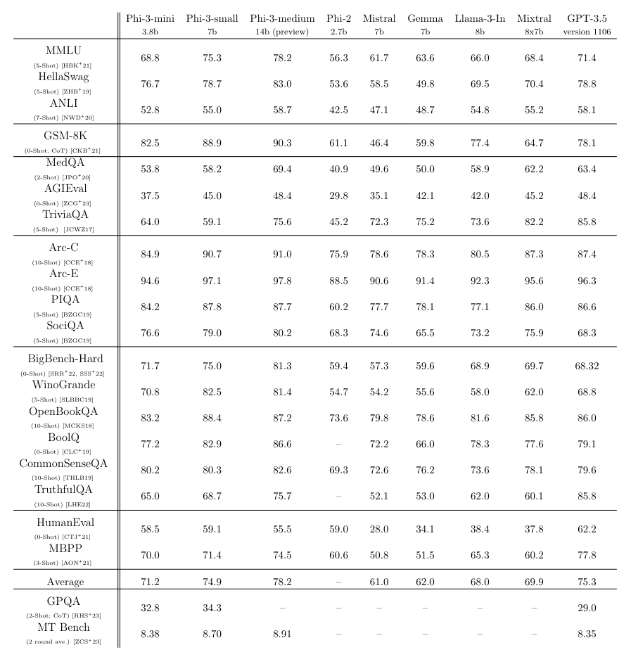 Phi-3-small mit 7 Milliarden Parametern und Phi-3-medium mit 14 Milliarden Parametern, die beide mit 4,8 Billionen Token trainiert wurden, schneiden in den Benchmarks noch besser ab als Phi-3-mini.