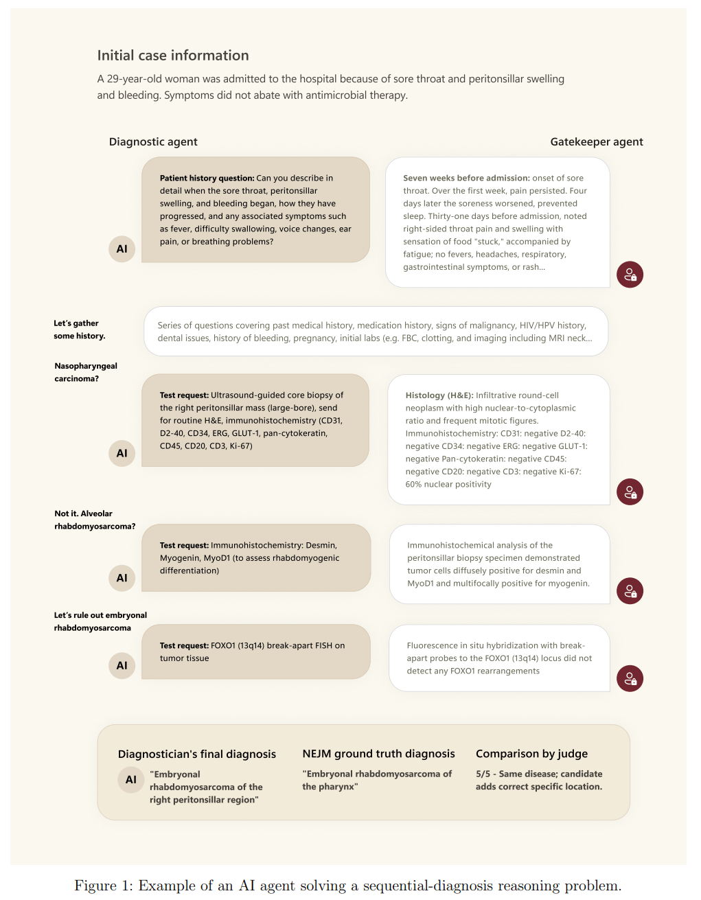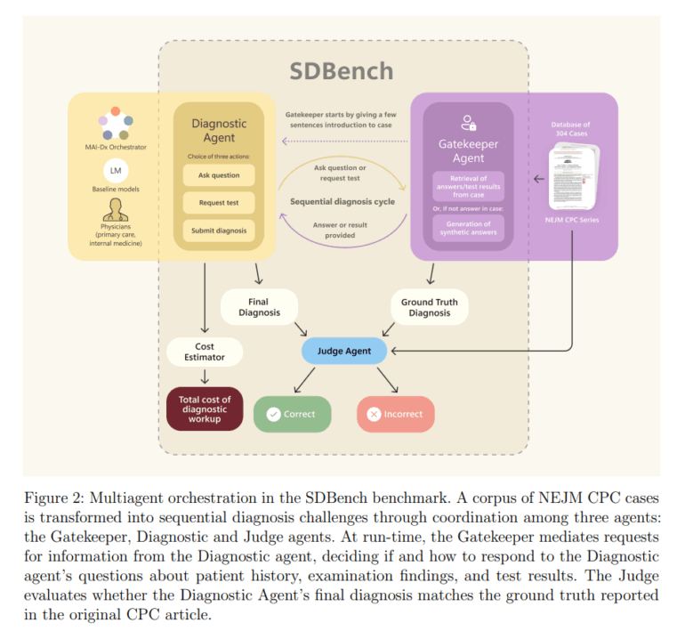 SDBench basiert auf 304 diagnostisch anspruchsvollen Fallberichten aus dem New England Journal of Medicine (NEJM). Ein KI- oder menschlicher Diagnostiker erhält zu Beginn nur eine kurze Fallzusammenfassung und muss aktiv weitere Informationen durch gezielte Fragen oder die Anforderung von Tests anfordern. Ein "Gatekeeper"-Modell gibt dabei nur die explizit angeforderten Informationen preis und kann laut dem Paper sogar realistische, synthetische Ergebnisse für Tests generieren, die im ursprünglichen Fall nicht beschrieben wurden, um keine unbeabsichtigten Hinweise zu geben.
