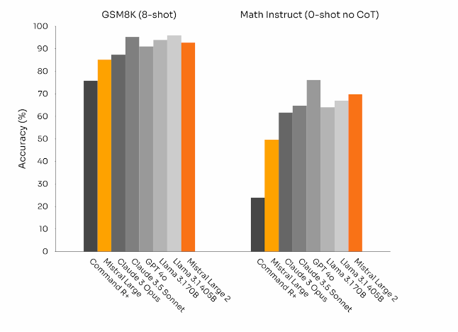 Laut Mistral wurde Large 2 so optimiert, dass es vorsichtiger und kritischer in seinen Antworten ist und zugibt, wenn es keine Lösung finden kann oder nicht über genügend Informationen verfügt, um eine sichere Antwort zu geben. Dieses Bemühen um Genauigkeit spiegele sich in der verbesserten Leistung bei mathematischen Aufgaben wider. Allerdings erreicht Large 2 auch hier keine neuen Spitzenleistungen.