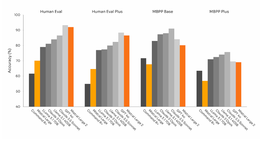 Bei Code übertrifft es das vorherige Mistral Large deutlich und liegt gleichauf mit führenden Modellen wie GPT-4o, Claude 3.5 Sonnet und Llama 3 405B.