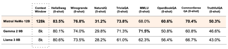 Mistral NeMo basiert auf einer Standardarchitektur und könne daher leicht in bestehende Systeme integriert werden. Im Vergleich zu anderen Open-Source-Modellen wie Gemma-2-9B und LLaMA-3-8B zeigt das NeMo-Basismodell in Benchmarks ähnliche oder bessere Ergebnisse, unterstützt dabei jedoch sogar ein 16-mal so großes Kontextfenster.