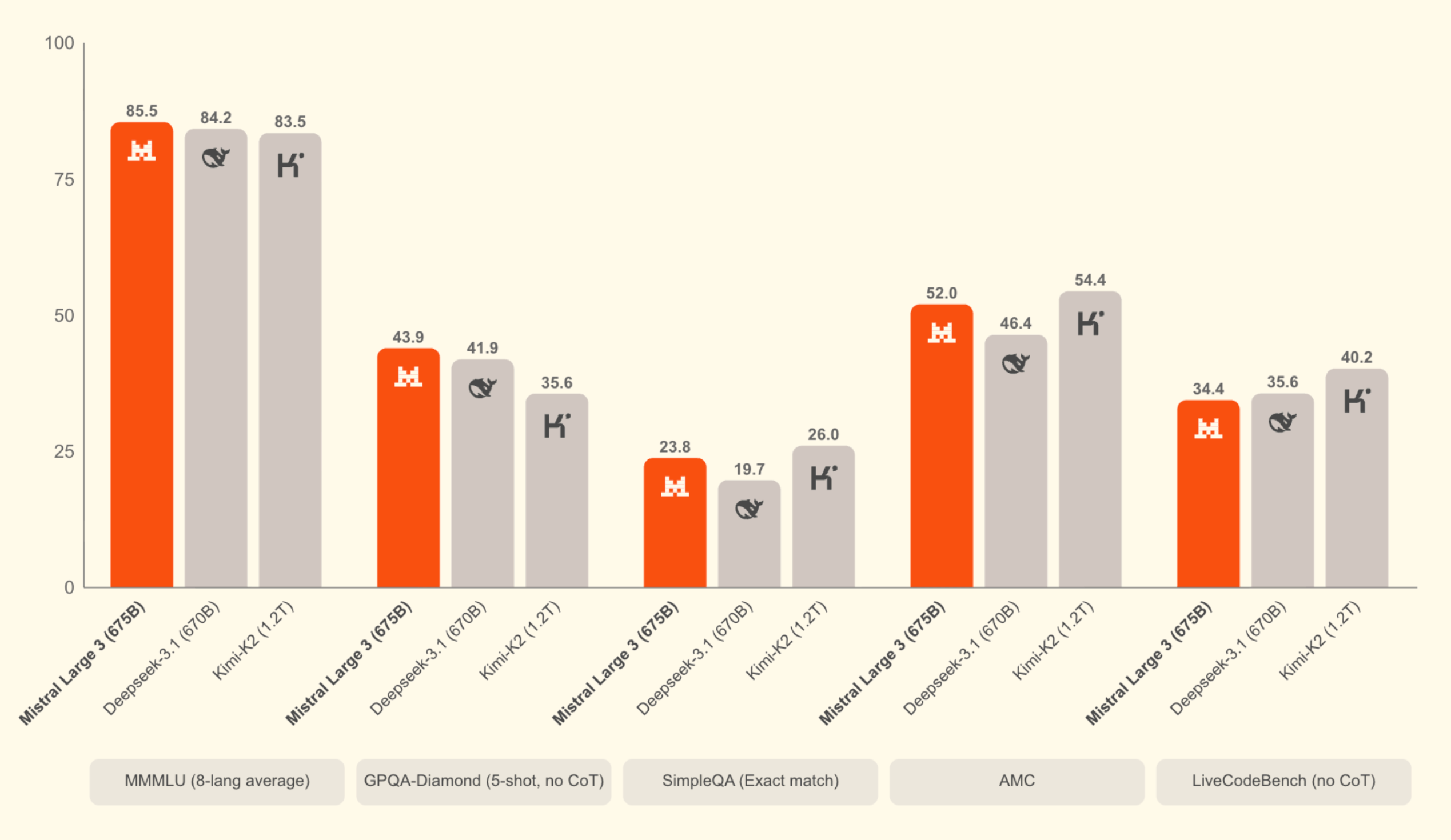 Mistral Large 3 ist vollständig quelloffen und unter der Apache‑2.0‑Lizenz verfügbar. Es soll bei allgemeinen Sprachaufgaben mit führenden offenen Modellen gleichziehen und zugleich Bildinhalte verstehen. Laut Unternehmensangaben liegt es auf dem LMArena-Leaderboard auf Rang zwei in der Kategorie der Open-Source-Modelle ohne Reasoning und auf Rang sechs in der Kategorie der OSS-Reasoning-Modelle. In den veröffentlichten Benchmarks liegt das Modell auf Augenhöhe mit den offenen Angeboten anderer Anbieter wie Qwen oder Deepseek. Allerdings hat Deepseek erst gestern mit V3.2 ein neues Modell veröffentlicht, das in einigen Benchmarks noch einmal deutlich gegenüber dem Vorgänger zugelegt hat.