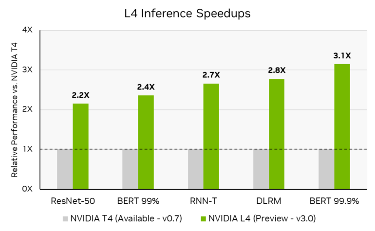 Neu im Benchmark ist die L4 Tensor GPU von Nvidia, die das Unternehmen erst kürzlich auf der GTC vorgestellt hat. Die Karte ist bereits bei einigen Cloud-Anbietern erhältlich und liefert in den Benchmarks eine 2,2- bis 3,1-fach höhere Inferenzleistung als das Vorgängermodell T4.