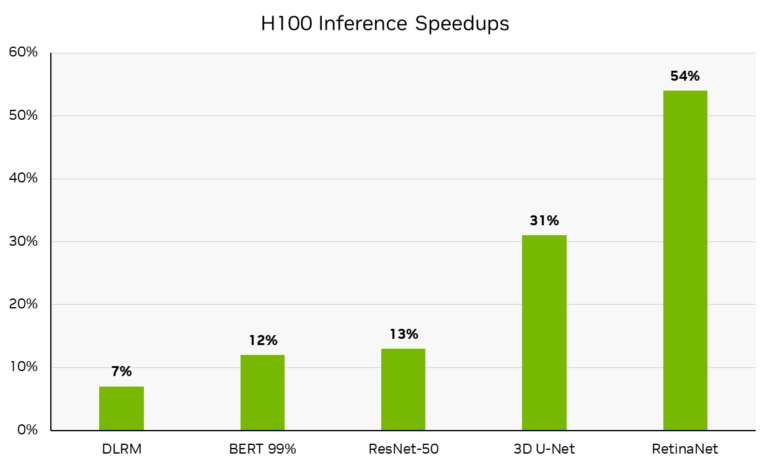 Laut Nvidia haben die H100 Tensor Core Grafikprozessoren in DGX H100 Systemen durch Softwareoptimierungen bis zu 54 Prozent mehr Inferenzleistung als im Vorjahr. Dieser Sprung findet sich in der RetinaNet Inferenz, andere Modelle wie BERT mit 99 % Genauigkeit laufen 12 % schneller, ResNet-50 13 % und 3D U-Net, das z.B. in der Medizin eingesetzt wird, 31 % schneller.