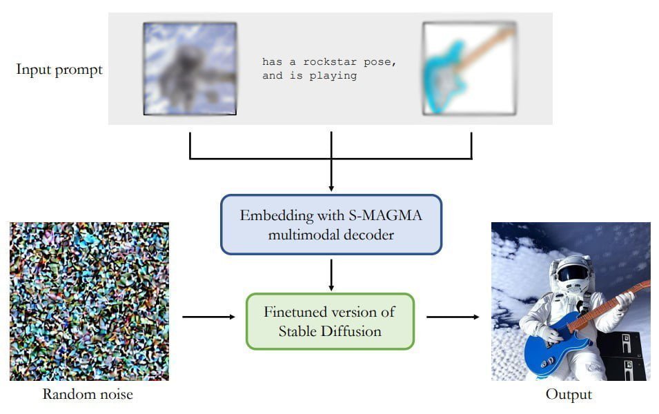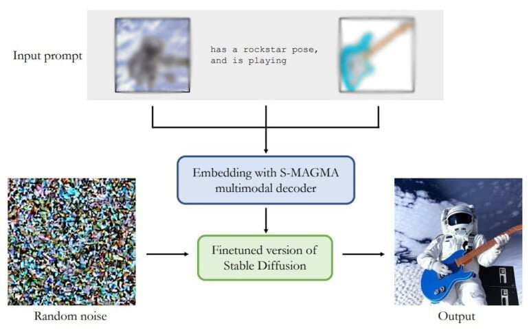 Herzstück der M-Vader-Architektur ist der multimodale Decoder S-MAGMA mit 13 Milliarden Parametern. Er kombiniert das Bild-Sprache-Modell MAGMA mit einem für semantische Suche feingetunten Luminous 13B-Modell. Beide vortrainierten Modelle stammen von Aleph Alpha. Der Output von S-MAGMA leitet den Bildgenerierungsprozess mit einer für multimodale Verarbeitung feingetunten Stable-Diffusion-Version an.