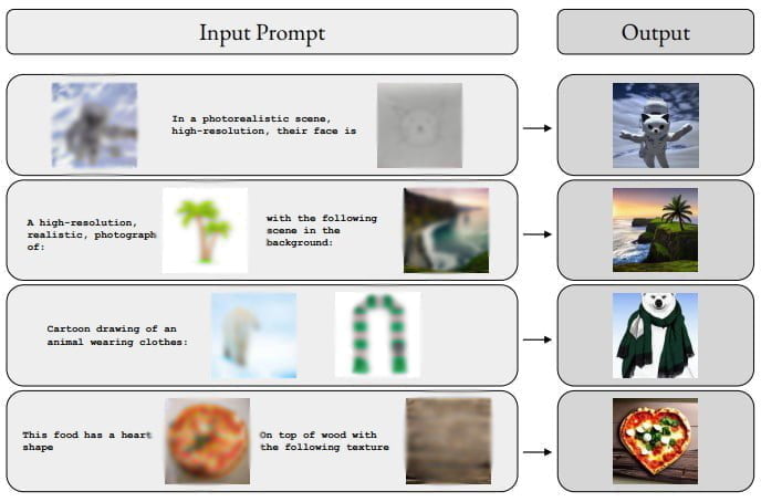M-Vader kann laut des Teams Bilder anhand von multimodalem Kontext generieren, aus zwei Bildern ein neues Bild oder Variationen eines Bildes erschaffen. Die folgende Grafik zeigt einige Beispiele für die Zusammenführung von mehreren Bildern samt Textanweisungen zu einem neuen Bild.