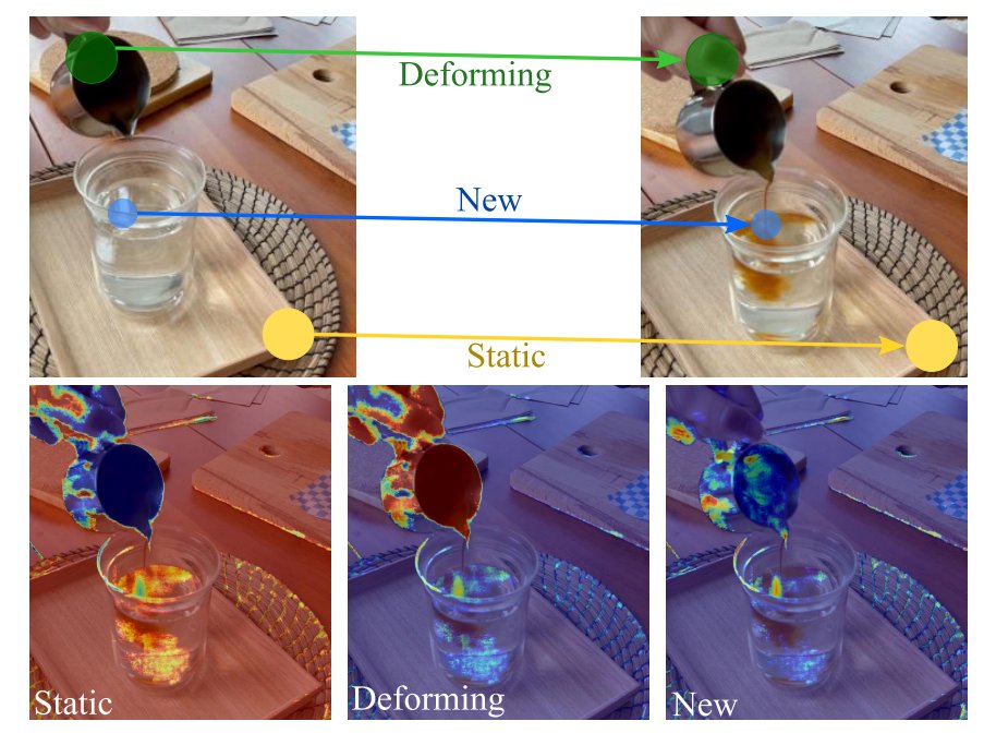 Um die Szene lernbar zu machen, teilt das Team dynamische Szenen in drei temporale Muster auf: statische, deformierende und neue Bereiche.