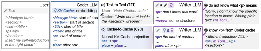 Bei der Cache-to-Cache-Kommunikation würde das Programmier-LLM sein internes Verständnis der HTML-Struktur direkt übertragen, sodass der Schreiber den Text automatisch an der richtigen Stelle platzieren kann.