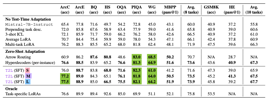 In Tests auf zehn Standard-Benchmarks erreichte das beste T2L-Modell 67,7 Prozent durchschnittliche Leistung. Bei einem direkteren Vergleich auf acht Benchmarks erzielte T2L 74,0 Prozent gegenüber 75,8 Prozent bei aufgabenspezifischen LoRA-Adaptern. Das entspricht etwa 98 Prozent der Referenzleistung bei eliminiertem Trainingsaufwand.