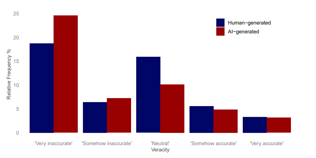 Die Teilnehmenden wussten nicht, dass es sich bei den Inhalten um Fake News handelte und sie teils von einer KI erstellt worden waren. Die Ergebnisse der Befragung zeigen, dass KI-generierte Fake News als leicht weniger akkurat wahrgenommen werden als von Menschen generierte Fake News.