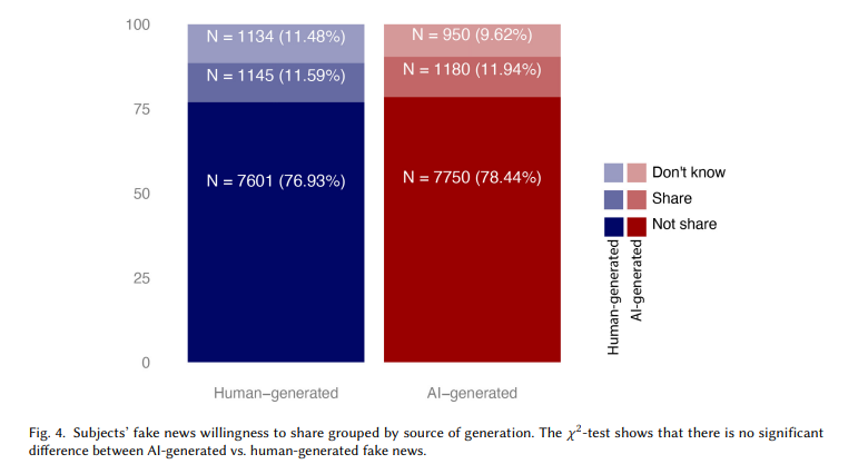 In beiden Fällen waren rund zwölf Prozent der Teilnehmenden bereit, die Fake News in Social Media zu teilen. Die Forscher fanden keinen statistisch signifikanten Unterschied in der Bereitschaft, von Menschen generierte Fake News im Vergleich zu KI-generierten Fake News zu teilen.
