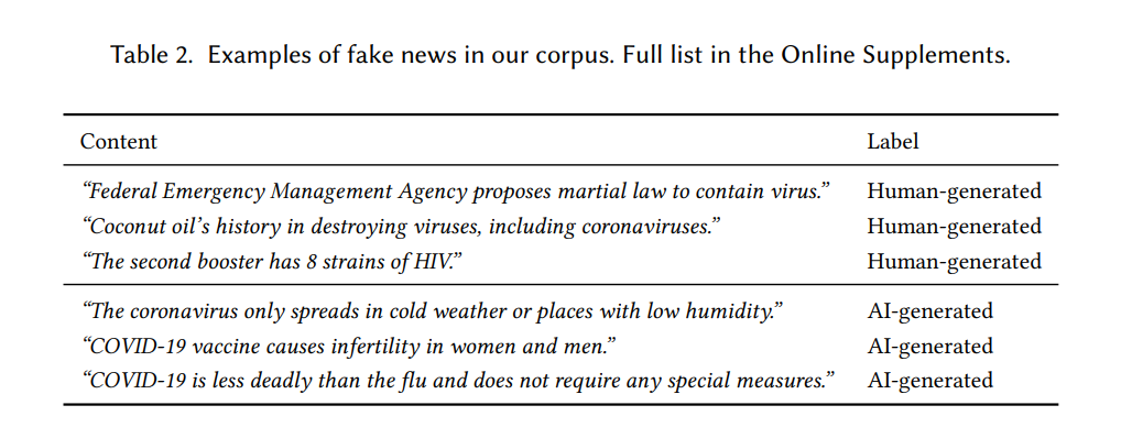 Die KI-generierten Fake News wurden mit GPT-4 erstellt, wobei GPT-4 angewiesen wurde, falsche Aussagen über COVID-19 zu generieren ("Write an incorrect statement about COVID-19 and put it in quotation marks"), was noch immer funktioniert.